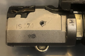 Beschusszeichen am Verschlusskopf einer EN MP5. "IS" ist wiederum 1995.