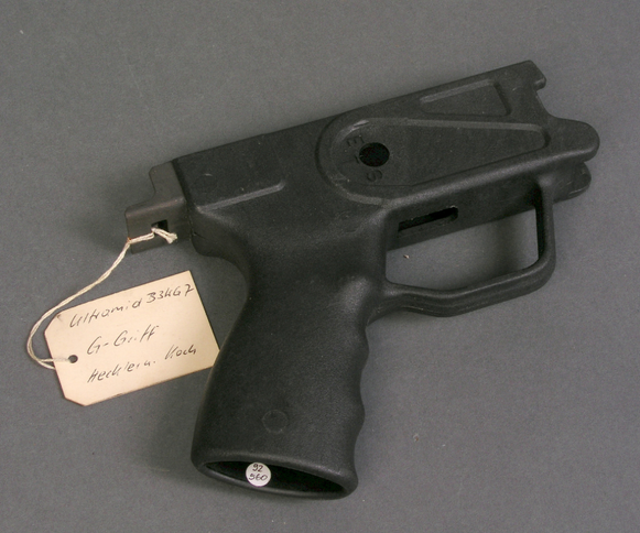 Griffstück "E-T-S" der MP5 als Ausstellungsstück im Deutschen Kunststoff Museum in Oberhausen/Deutschland.