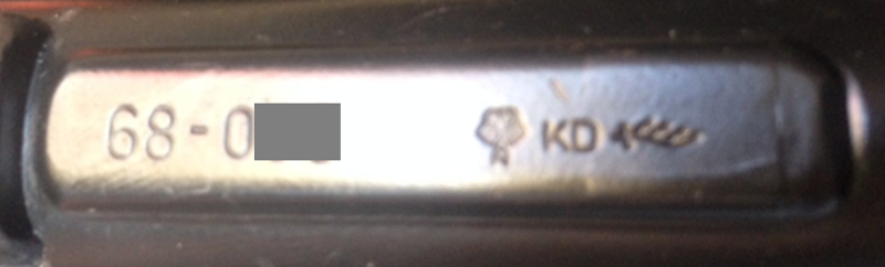 Markings einer MP5/10 plus Seriennummer dreistellig, plus deutsches amtliches Beschusszeichen, Datecode KD = 1993 und Ulmer Beschusszeichen.