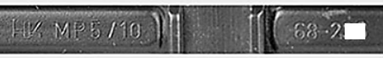 Markings einer MP5/10 plus Seriennummer vierstellig, plus deutsches amtliches Beschusszeichen, Datecode (unleserlich) und Ulmer Beschusszeichen.