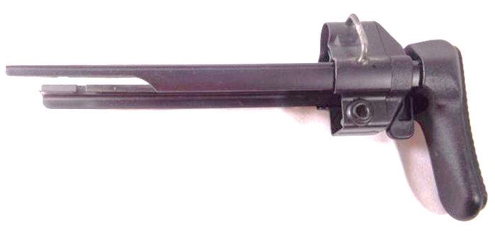 Wegen des Bolt‑Catch‑Mechanismus der MP5/10 und der weiter unten beschriebenen MP5/40 musste die linke Schiene der einschiebbaren Schulterstütze im betreffenden Bereich ausgeschnitten werden.