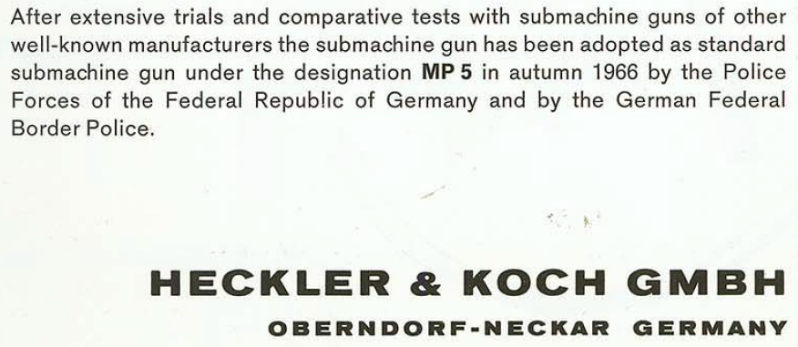 Gemäss dieser Broschüre von Heckler & Koch wurde die MP5 bei ersten deutschen Polizeibehörden und beim Bundesgrenzschutz im Herbst 1966 eingeführt.