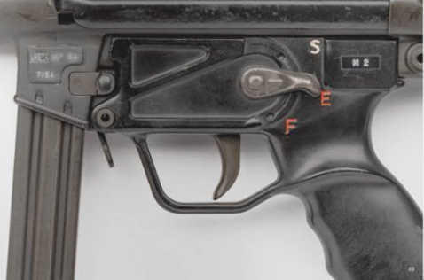 Die MP5 in der ab 1966 definitiven Form. Das Magazin zeigt das Datum 9/67. Die Aufnahme macht einen authentischen Eindruck und die Waffe dürfte somit effektiv aus dieser Zeitspanne stammen. Diese MP5 zeigt alle Attribute einer frühen, also ab 1966 und vor 1973/74 produzierten Waffe: Gehäuse Oberseite flach, Oberfläche parkerisiert (also ohne Farbauftrag), konkave Schaftkappe, Griffstück unten geschlossen, dreieckige Formvertiefungen auf Griffstück entsprechend einer vor 1973/74 hergestellten Waffe etc. Das einfachste Erkennungsmerkmal einer vor 1973/74 hergestellten MP5 ist aber sicher das oben flache Gehäuse, also ohne Montagepunkte für Zielhilfsmittel.