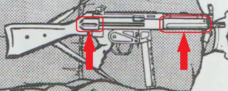 Ich würde sagen, diese Illustration stammt ebenfalls aus dem Jahre 1966 und zeigt eine Vor‑ bzw. Nullserienwaffe HK 54 / MP5 in der Ausführung "A1", also mit Abschlusskappe anstelle eines Schafts. Deutlich erkennbar ist auch hier die noch von den Prototypen übernommene Ausformung der Sicke bzw. Verstärkungsstruktur am Magazinschacht, die bei der späteren Serien‑MP5 leicht anders gestaltet wurde.
