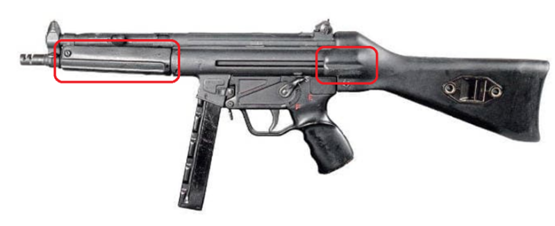 Eine MP5 mit Fertigungsdatum September 1973. Man erkennt deutlich, dass die Oberfläche "nur" parkerisiert ist. Also ohne farblichen Überzug.