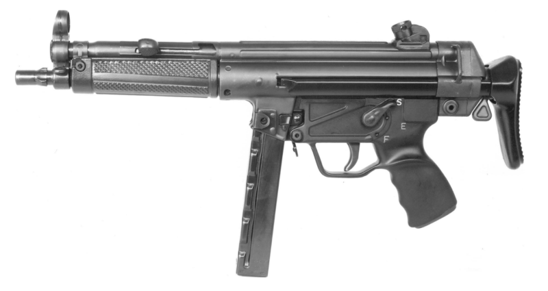 Auf diesem Bild (entstanden in der Türkei) sieht man eine vor 1973/74 gefertigte HK MP5 A1, also mit Abschlusskappe. Es ist das bislang einzige historische Foto, welches ich gefunden habe, welches eine MP5 in der Ausführung A1 zeigt. Die Abschlusskappe auf dieser Aufnahme ist aus Metall und nicht aus Kunststoff gefertigt. Es ist übrigens zu erkennen, dass zwei gerade Magazine mit Tape gekoppelt sind.